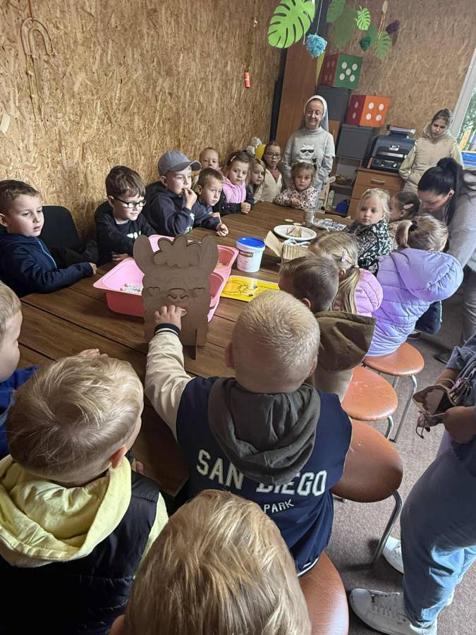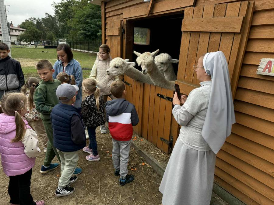 W środę 17 września dzieci z grupy Krasnale odwiedziły Specjalny Ośrodek Wychowawczy w Mocarzewie. Przedszkolaki miały tam okazje wziąć udział w różnorodnych grach i zabawach, których tematem przewodnim były alpaki. Dzięki Siostrze Elwirze i Pani Malwinie dzieci dowiedziały się wielu ciekawostek o życiu i zwyczajach tych sympatycznych zwierząt. Grupa na pamiątkę wyklejała własne alpaki naturalną wełną. Główną atrakcją dla najmłodszych była możliwość głaskania i karmienia zwierząt.
