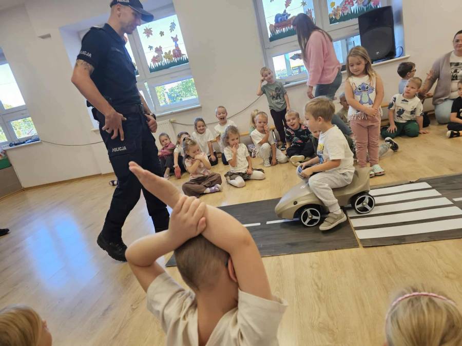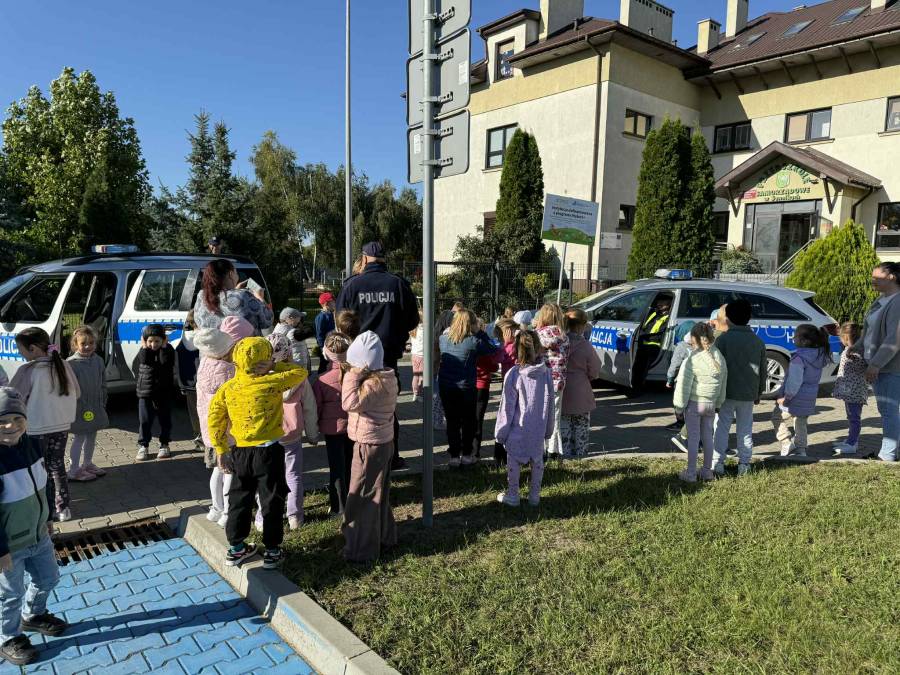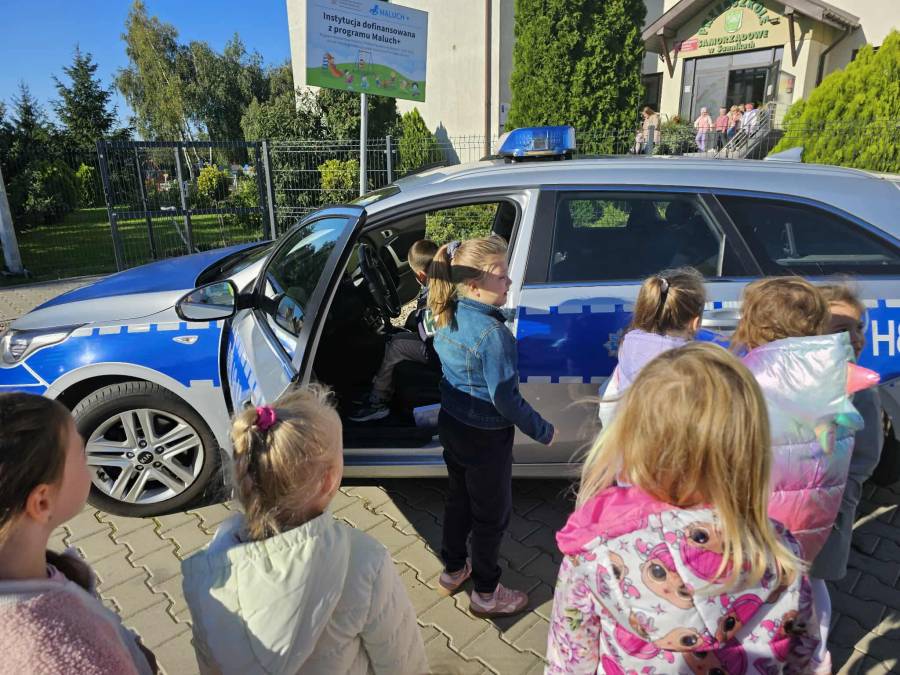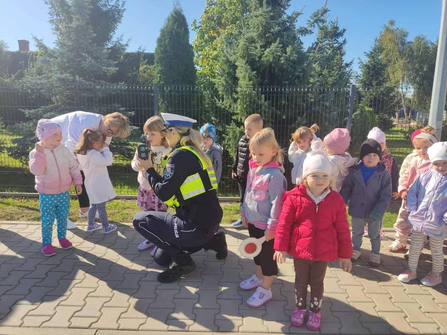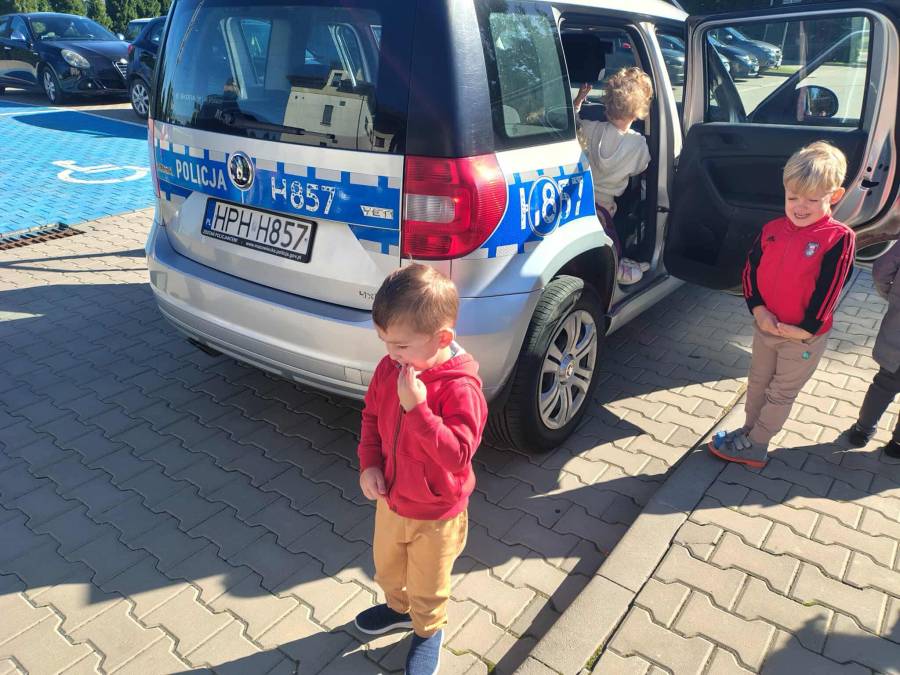 25 września w czwartek w naszym przedszkolu odbyło się spotkanie z policjantami. Głównym celem wizyty było przypomnienie podstawowych zasad bezpieczeństwa oraz zapoznanie z zawodem policjanta. Nasi goście przybliżyli dzieciom podstawowe zasady bezpiecznego poruszania się po drogach oraz przypomnieli numery alarmowe. Nasze przedszkolaki dowiedziały się, jak bezpiecznie podróżować, jak ważne jest zapinanie pasów bezpieczeństwa podczas jazdy samochodem. Panowie Policjanci nawiązali również do konieczności noszenia ubrań posiadających elementy odblaskowe. Podczas spotkania przedszkolaki zadawały pytania oraz dzieliły się swoimi doświadczeniami. Dużym zainteresowaniem cieszyła się prezentacja ubioru i wyposażenia policyjnego, niezbędnego podczas wykonywania pracy policjanta. Dużą atrakcją były radiowozy policyjne. Dzieci mogły je obejrzeć, usiąść na siedzeniach, wykonać pamiątkowe zdjęcie. Jednak najwięcej radości wzbudziło włączenie policyjnych syren.