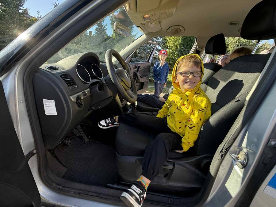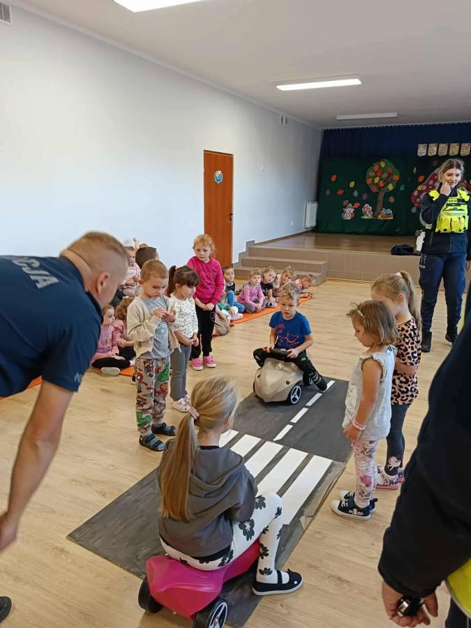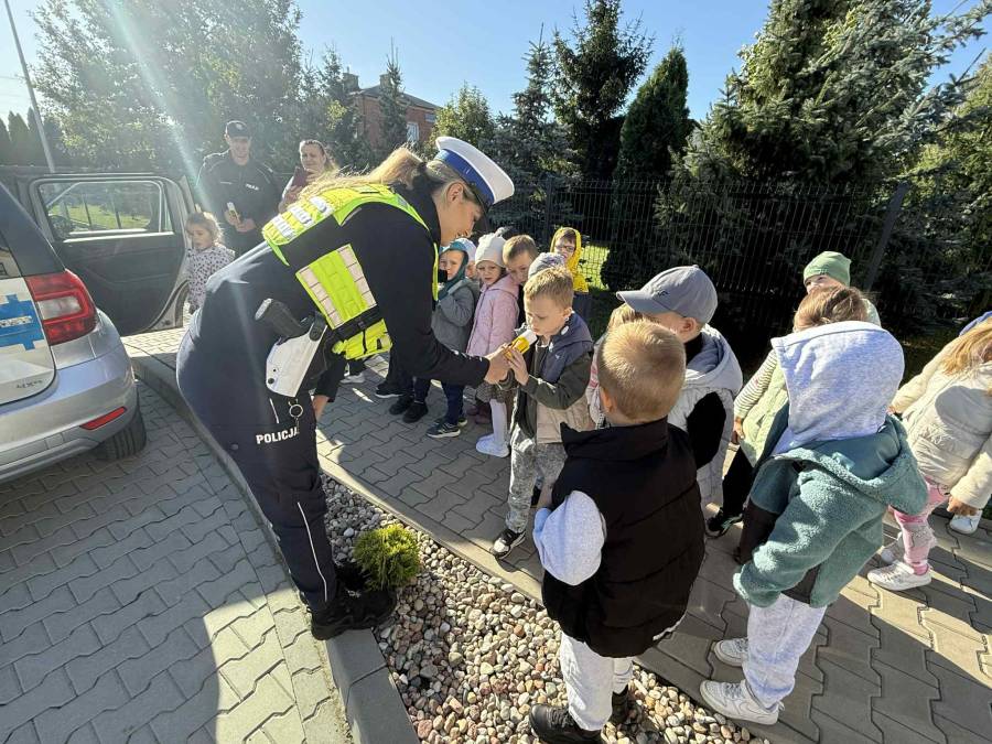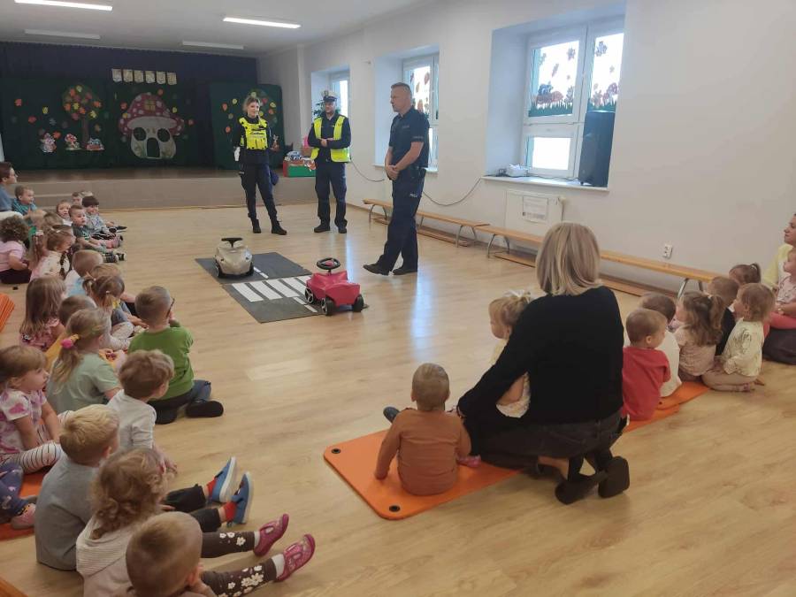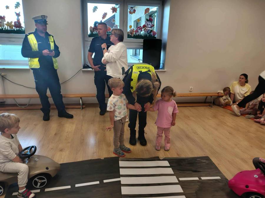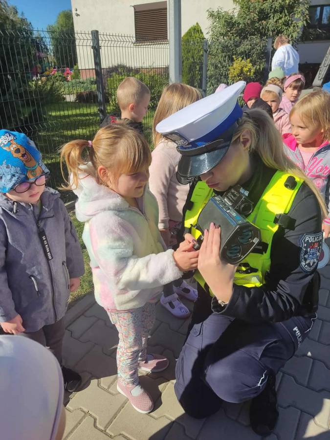 25 września w czwartek w naszym przedszkolu odbyło się spotkanie z policjantami. Głównym celem wizyty było przypomnienie podstawowych zasad bezpieczeństwa oraz zapoznanie z zawodem policjanta. Nasi goście przybliżyli dzieciom podstawowe zasady bezpiecznego poruszania się po drogach oraz przypomnieli numery alarmowe. Nasze przedszkolaki dowiedziały się, jak bezpiecznie podróżować, jak ważne jest zapinanie pasów bezpieczeństwa podczas jazdy samochodem. Panowie Policjanci nawiązali również do konieczności noszenia ubrań posiadających elementy odblaskowe. Podczas spotkania przedszkolaki zadawały pytania oraz dzieliły się swoimi doświadczeniami. Dużym zainteresowaniem cieszyła się prezentacja ubioru i wyposażenia policyjnego, niezbędnego podczas wykonywania pracy policjanta. Dużą atrakcją były radiowozy policyjne. Dzieci mogły je obejrzeć, usiąść na siedzeniach, wykonać pamiątkowe zdjęcie. Jednak najwięcej radości wzbudziło włączenie policyjnych syren.