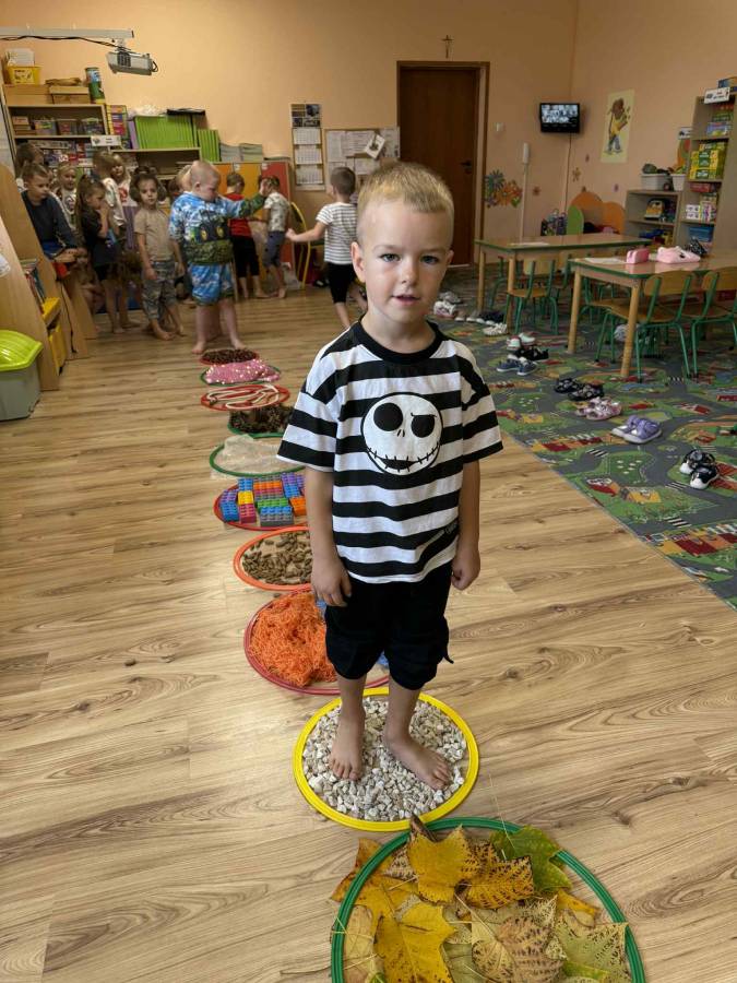 W naszym przedszkolu odbył się niezwykle ciekawy i radosny ,,Dzień bez skarpetek". Dzieci z grupy Krasnale tego dnia zdjęły skarpetki, by odkrywać świat za pomocą stóp! Na sali przygotowana została specjalna ścieżka sensoryczna, po której przedszkolaki chodziły boso, poznając różne faktury i struktury. Na trasie znalazły się m.in. miękkie liście, kłujące szyszki, chłodne kamyczki, strzelająca folia bąbelkowa, pucha włóczka, pachnąca lasem kora drzew itp. Dzieci z ogromną ciekawością i radością sprawdzały, co kryje się pod ich stopami, porównywały wrażenia i uczyły się opisywać swoje odczucia. Nie zabrakło również zabaw ruchowych, masażyków stóp i relaksu przy spokojnej muzyce.