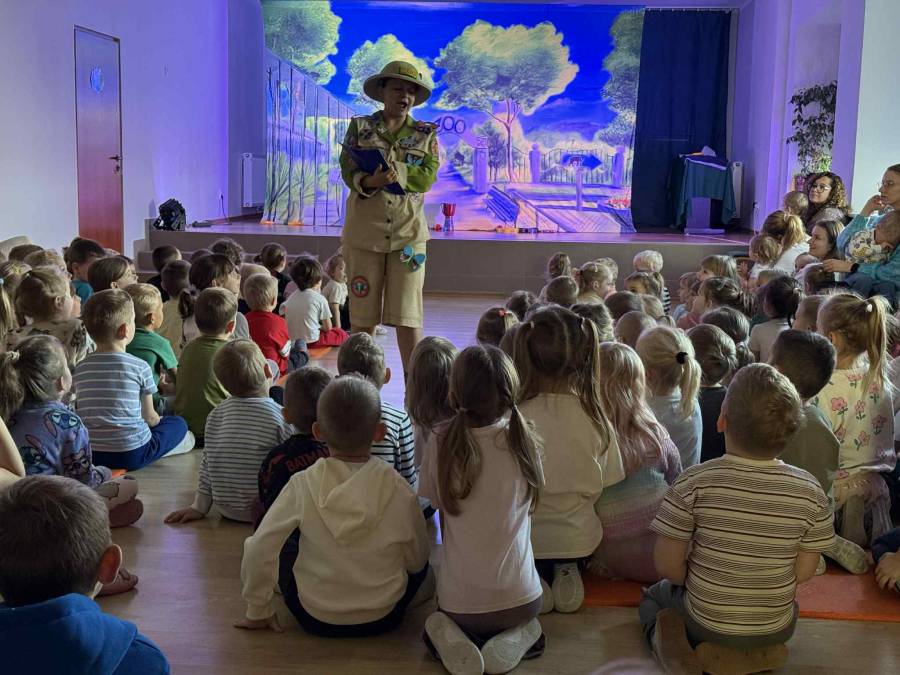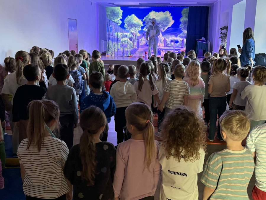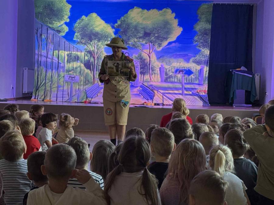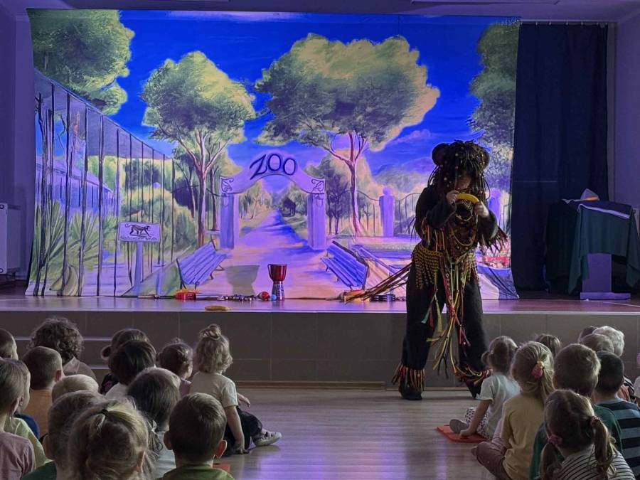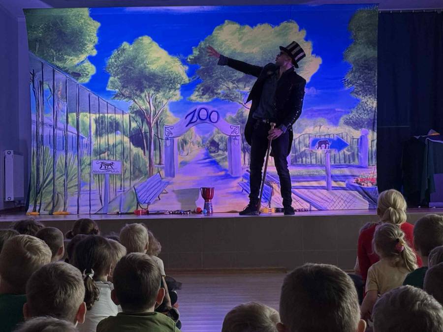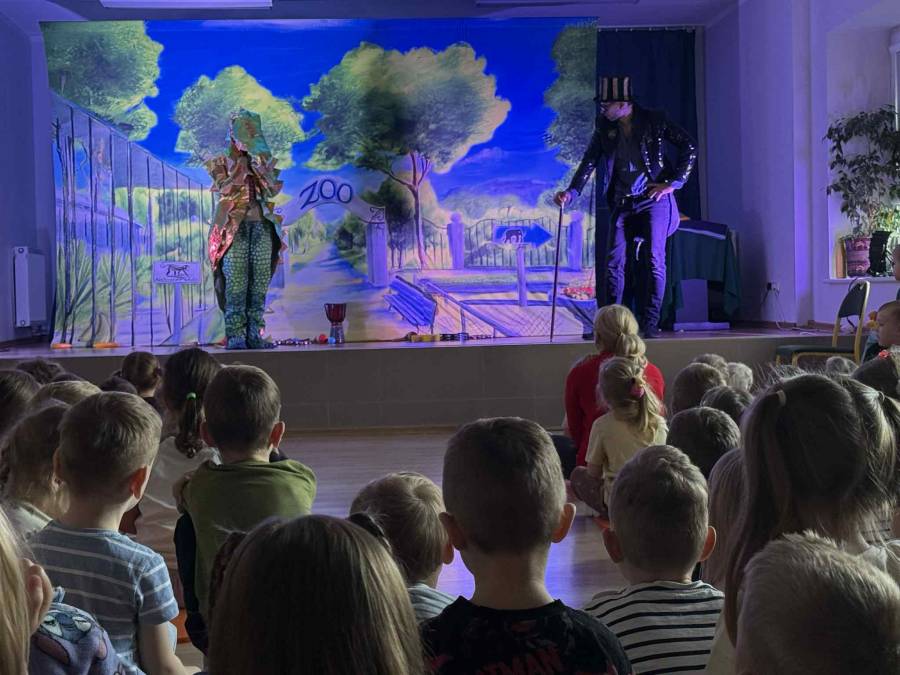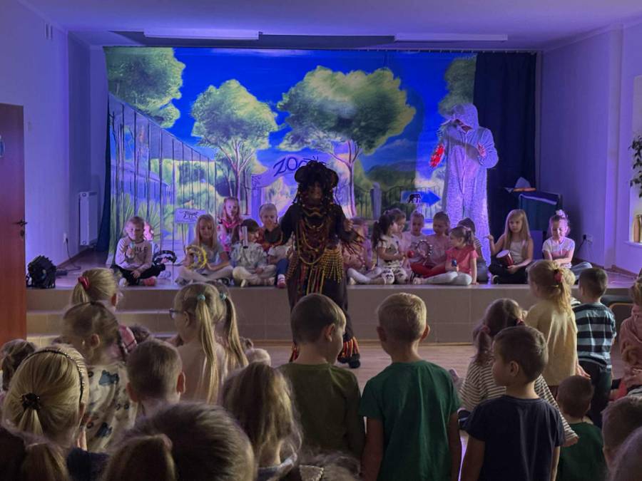 We wtorek 4 listopada nasze przedszkole odwiedził Teatr Katarynka z przedstawieniem pt. ,,Muzyczne Zoo,,. To niezwykłe, interaktywne widowisko muzyczne przeniosło dzieci w barwny świat zwierząt i dźwięków. Podczas spektaklu mali widzowie poznali wielu sympatycznych bohaterów - roztropnego słonia, wesołą małpkę i wiele innych zwierząt, które uczyły dzieci rytmu, ruchu i radości wspólnego śpiewania. Aktorzy wciągali przedszkolaki do wspólnej zabawy, zachęcając do klaskania, tańczenia i powtarzania dźwięków. Przedstawienie było pełne muzyki, kolorowych kostiumów i humoru, a jednocześnie niosło ze sobą ważne przesłanie o przyjaźni, szacunku do przyrody i zwierząt oraz współpracy.