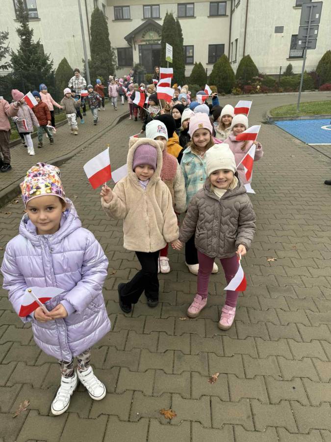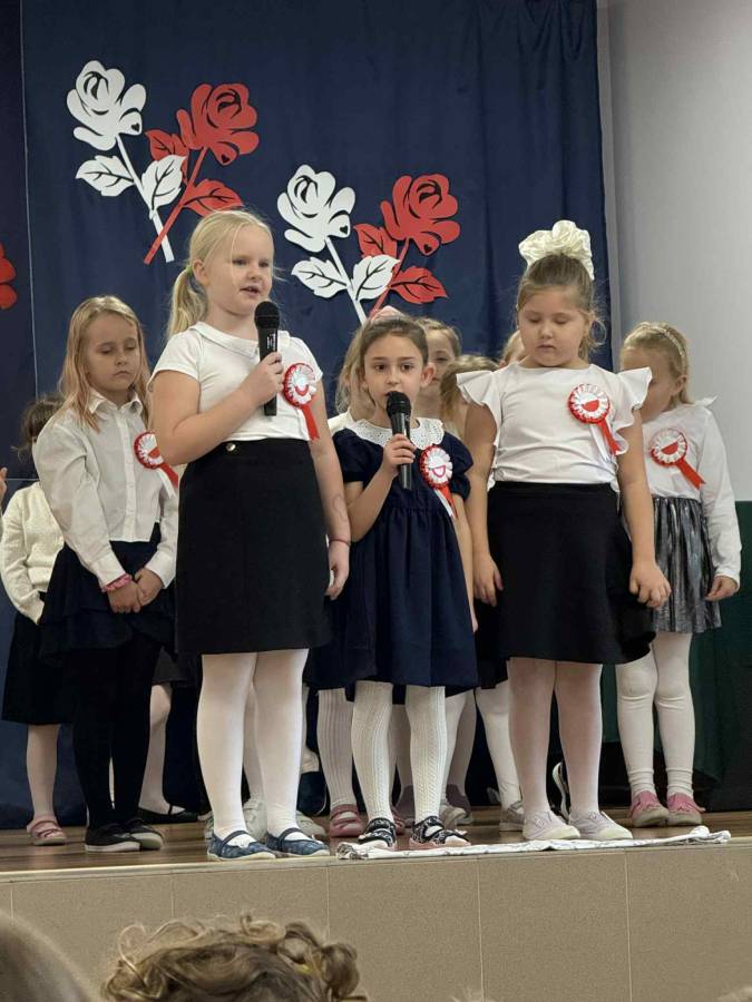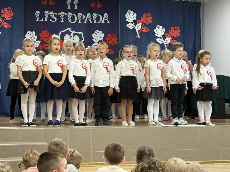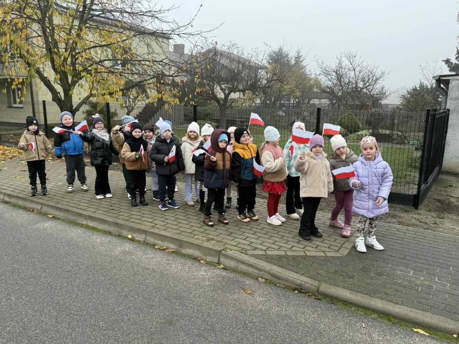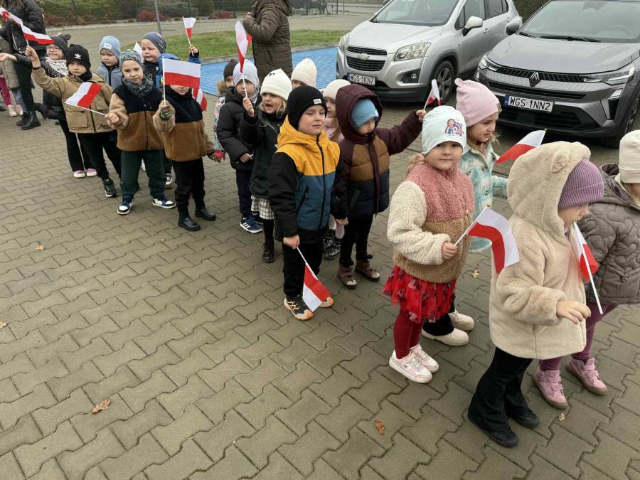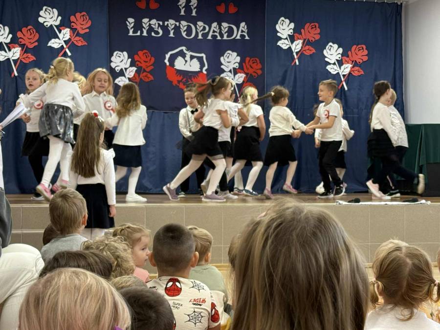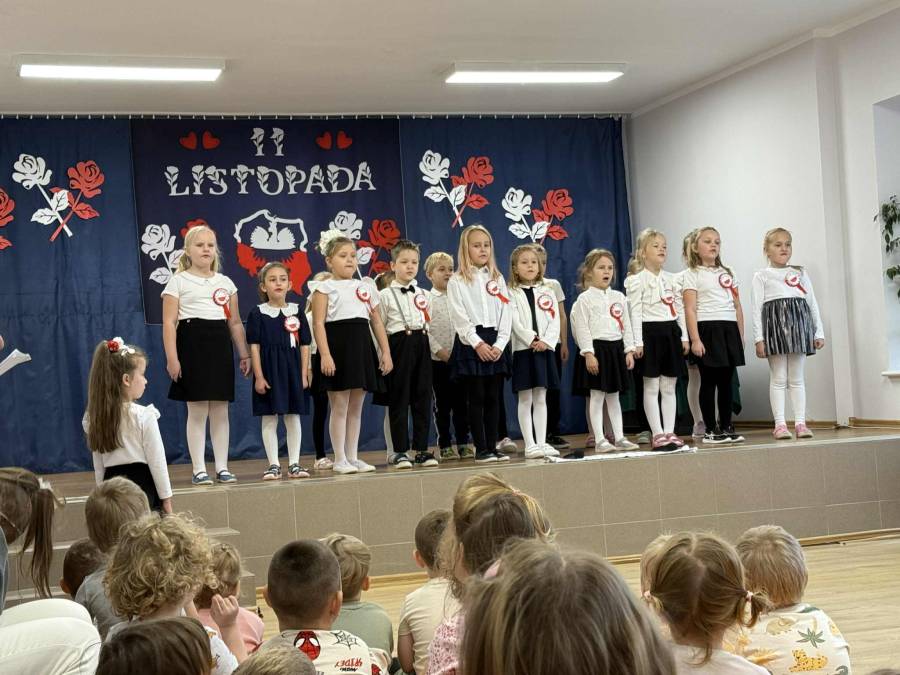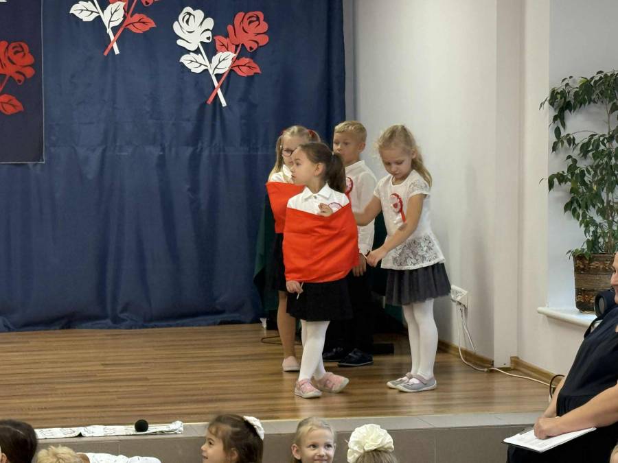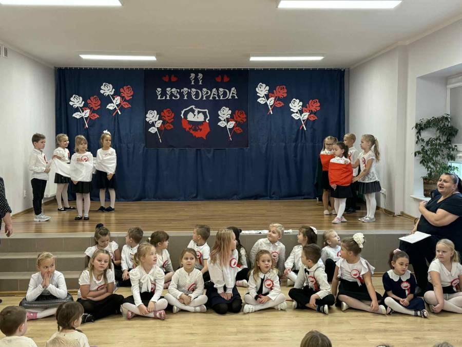 Po powrocie do przedszkola odbyła się uroczysta akademia. Dzieci z grup Biedronki i Motylki z dumą zaprezentowały przygotowany program artystyczny, w którym nie zabrakło patriotycznych wierszy, piosenek oraz tańców w biało-czerwonych barwach. Punktualnie o godzinie 11:11 wszystkie przedszkolaki wraz z całą społecznością przedszkolną wzięły udział w ogólnopolskiej akcji ,,Szkoła do hymnu,, , wspólnie odśpiewując cztery zwrotki ,, Mazurka Dąbrowskiego,,. Dzieci z wielkim zaangażowaniem i powagą uczciły to ważne dla naszego kraju święto.