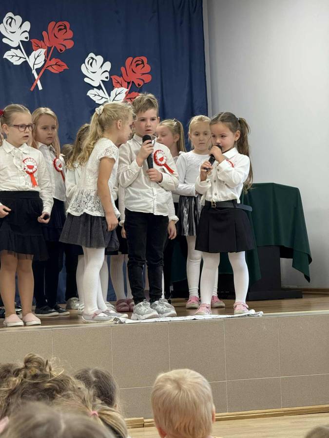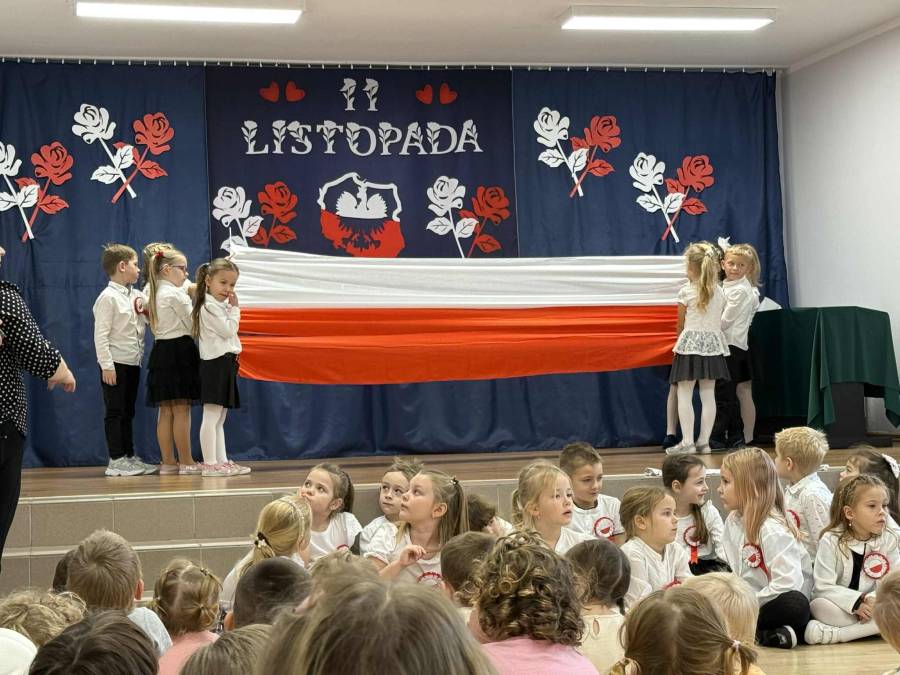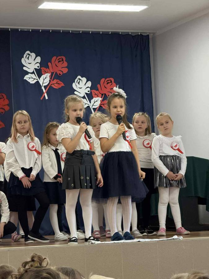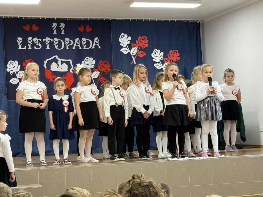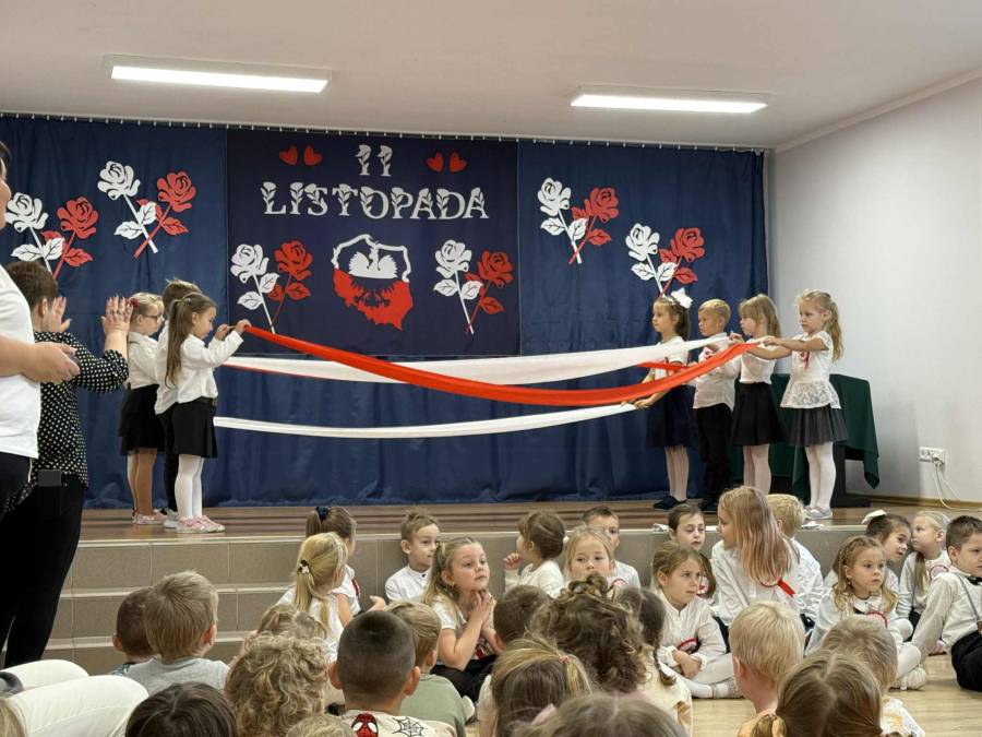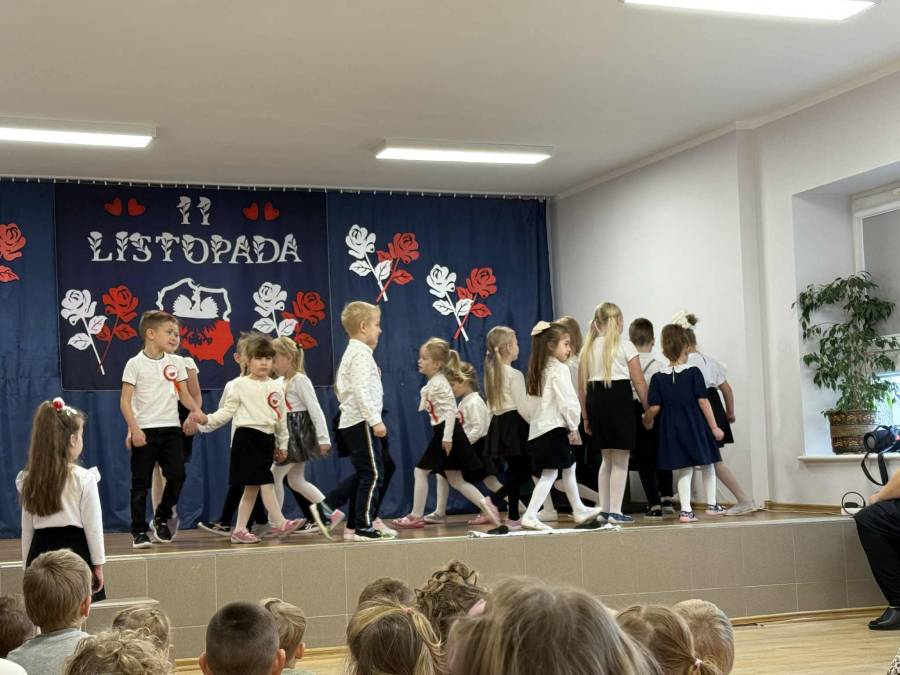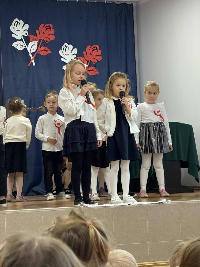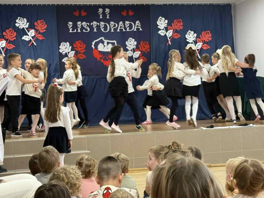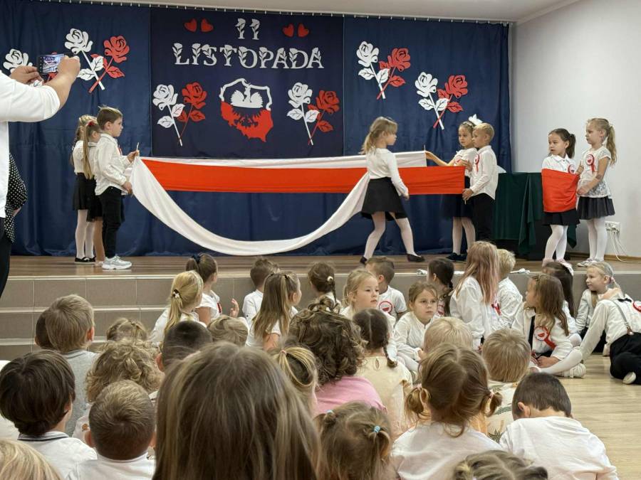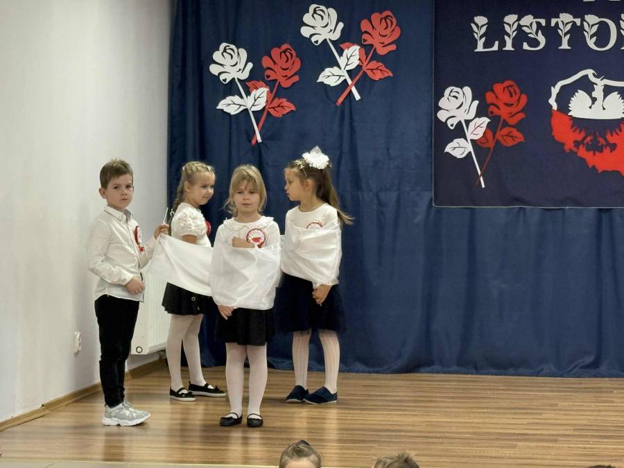 Po powrocie do przedszkola odbyła się uroczysta akademia. Dzieci z grup Biedronki i Motylki z dumą zaprezentowały przygotowany program artystyczny, w którym nie zabrakło patriotycznych wierszy, piosenek oraz tańców w biało-czerwonych barwach. Punktualnie o godzinie 11:11 wszystkie przedszkolaki wraz z całą społecznością przedszkolną wzięły udział w ogólnopolskiej akcji ,,Szkoła do hymnu,, , wspólnie odśpiewując cztery zwrotki ,, Mazurka Dąbrowskiego,,. Dzieci z wielkim zaangażowaniem i powagą uczciły to ważne dla naszego kraju święto.