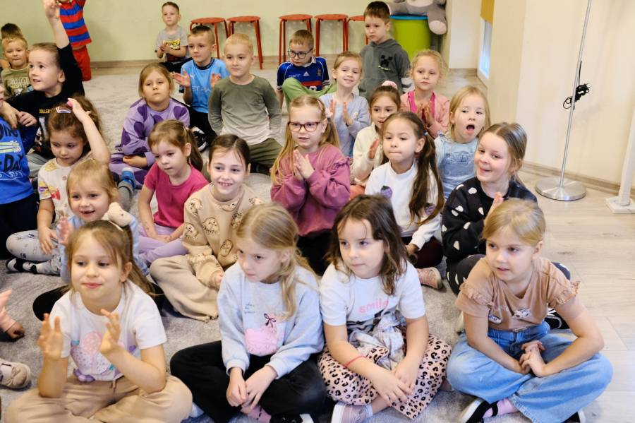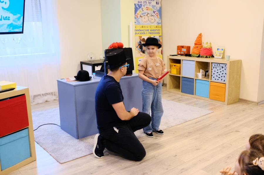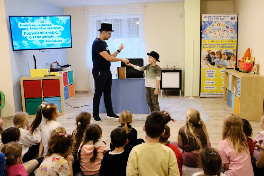 Spotkanie uatrakcyjnił pokaz iluzji oraz ,,zaczarowanego ołówka,, , który wzbudził wśród dzieci wiele radości, śmiechu i zachwytu. Dzieci z zaangażowaniem uczestniczyły w całym wydarzeniu, rozwijając kreatywność, ciekawość poznawczą oraz umiejętność obserwacji.