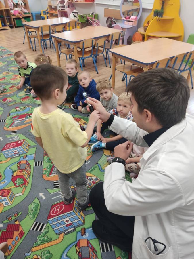 W grupie Smerfy odbyły się wyjątkowe zajęcia z udziałem lekarza i pielęgniarki. Dzieci miały okazję poznać specyfikę pracy w służbie zdrowia, a także zobaczyć z bliska narzędzia używane przez personel medyczny, takie jak stetoskop, otoskop, młotek neurologiczny czy strzykawki. Przedszkolaki, dowiedziały się do czego służą poszczególne przyrządy.