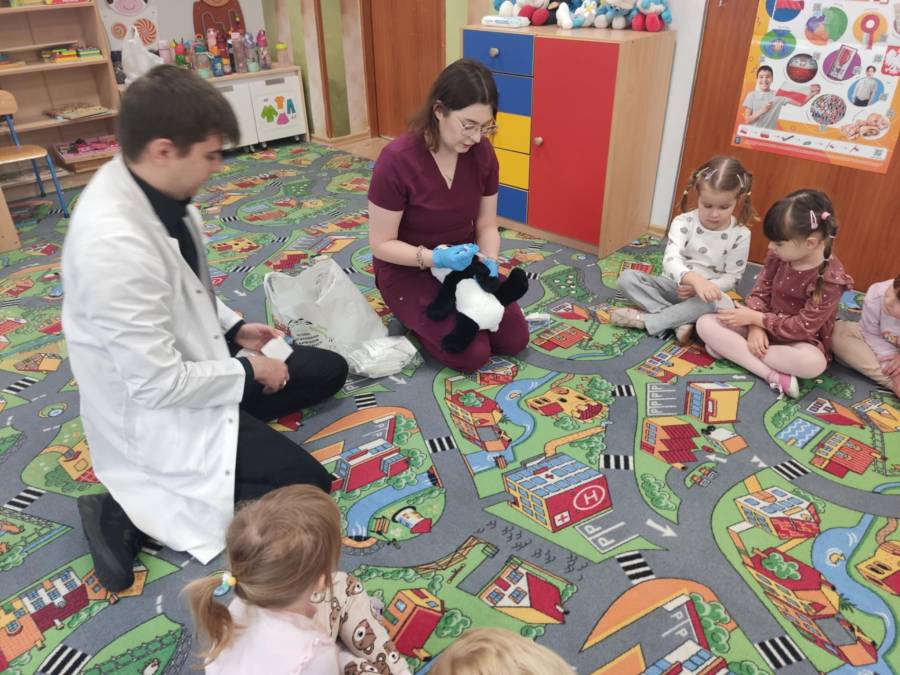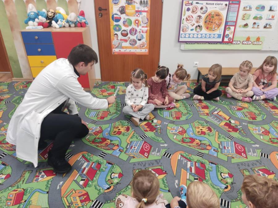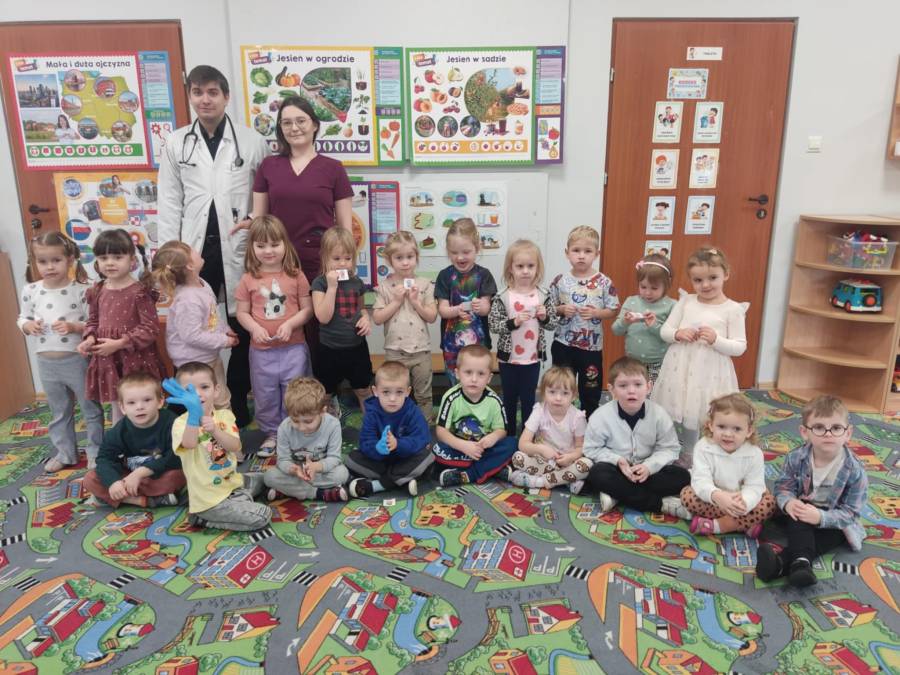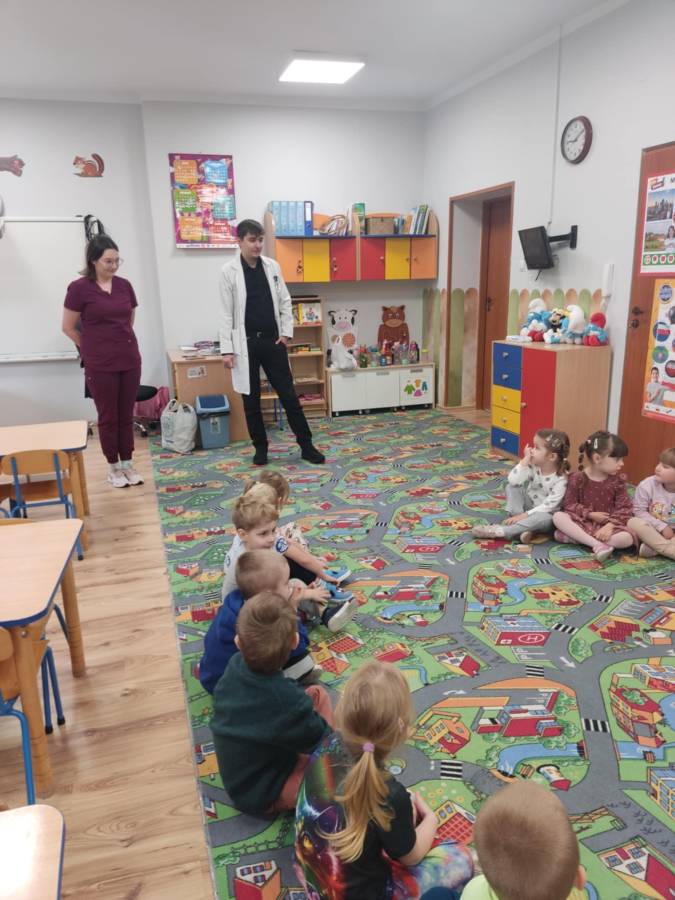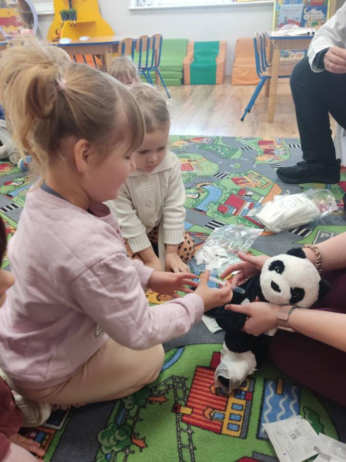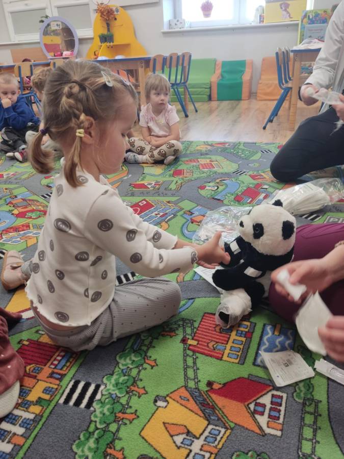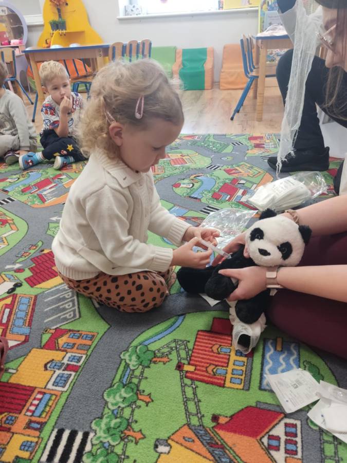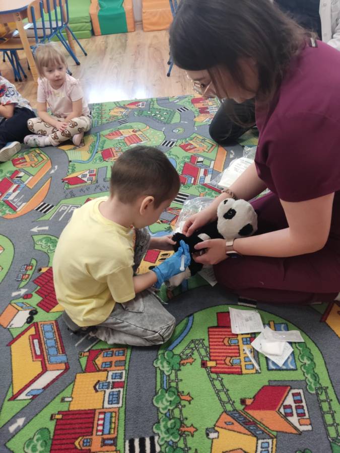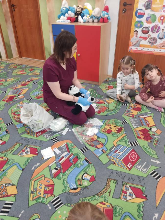 Na zakończenie zajęć odbyła się zabawa ,,Chory miś,,, podczas której dzieci wcielały się w rolę lekarzy i pielęgniarek, badały pluszowego pacjenta i udzielały mu pomocy. Spotkanie było nie tylko ciekawym doświadczeniem, ale także świetną okazją do oswojenia tematów związanych z wizytą u lekarza.
