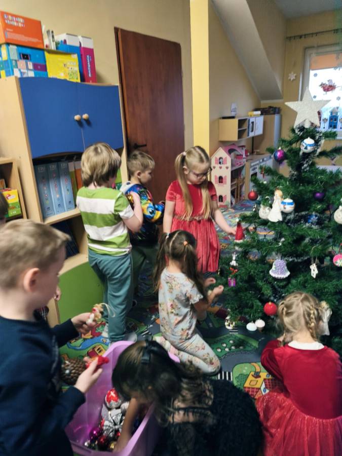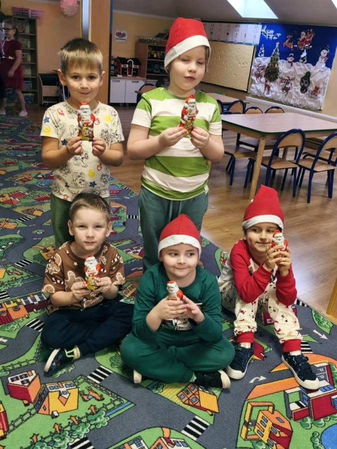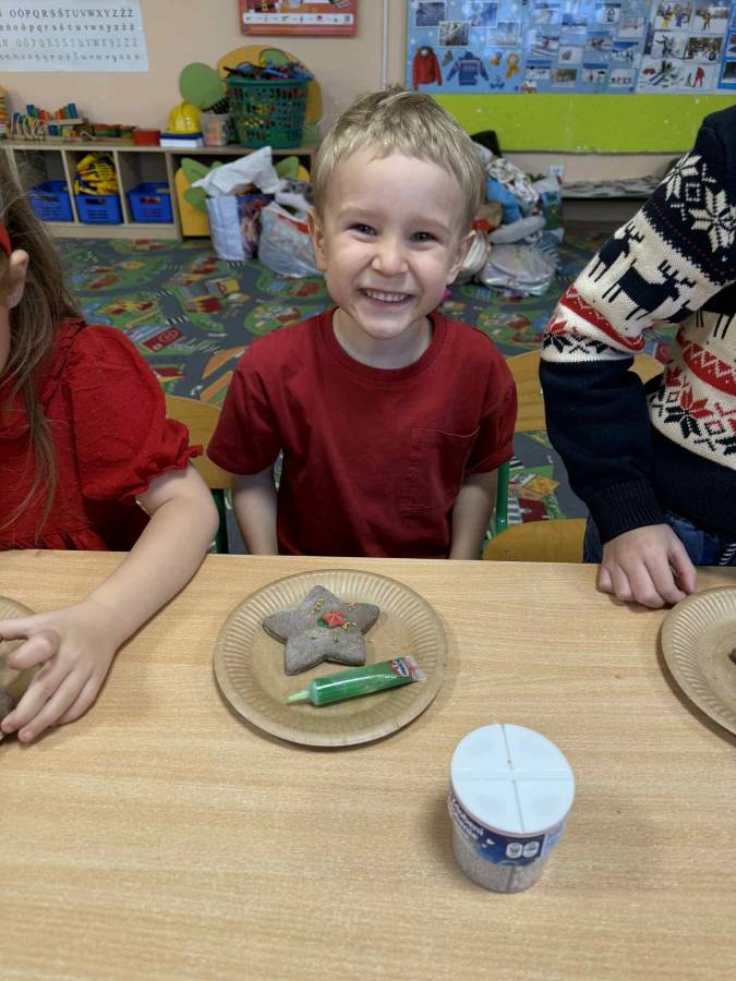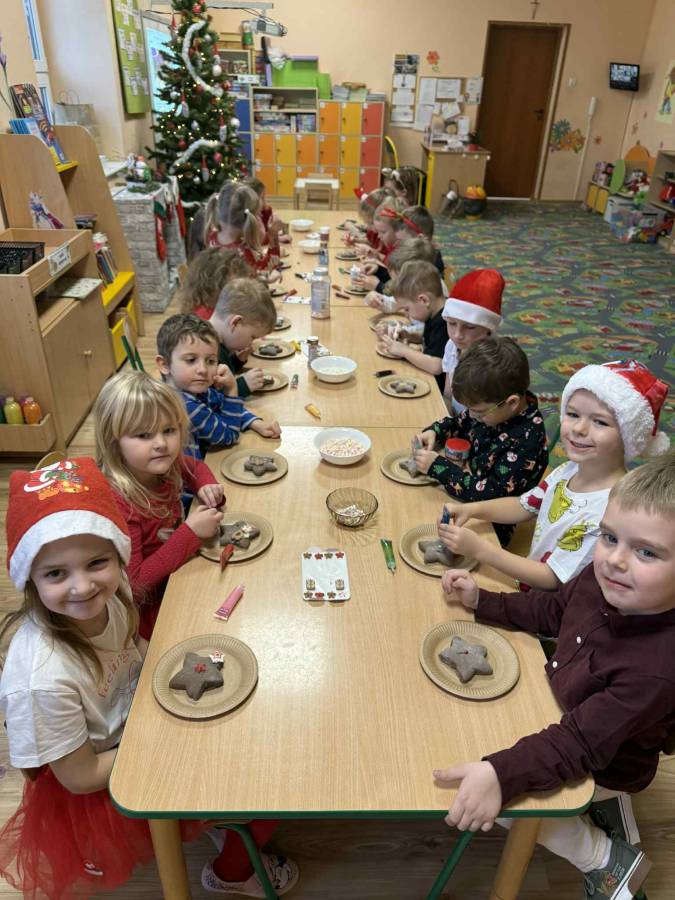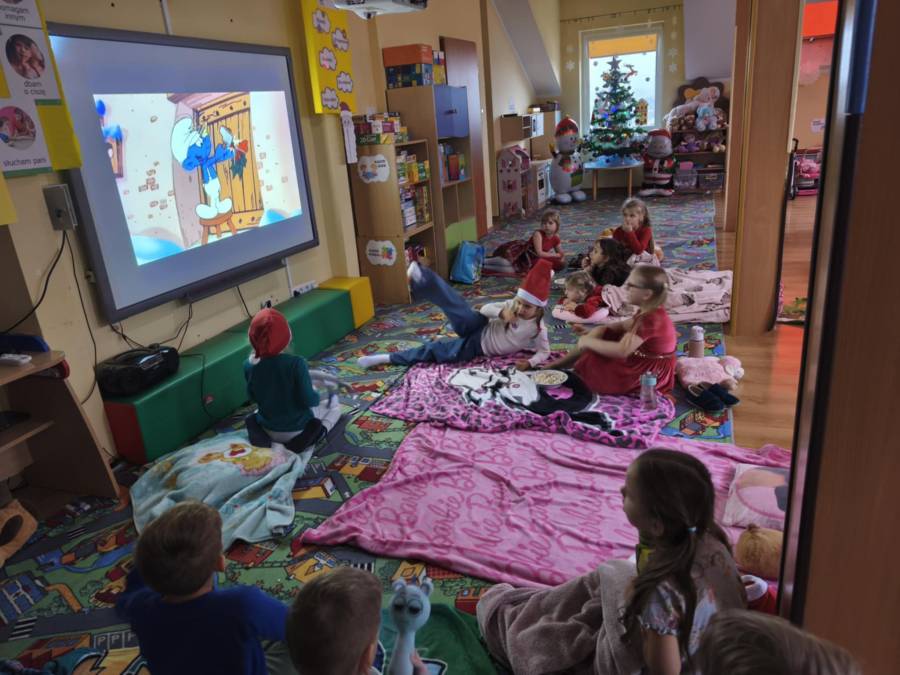 Mikołajki w naszym przedszkolu upłynęły w prawdziwie magicznej atmosferze! Już od rana w salach unosił się zapach świąt, a dzieci z wielkim entuzjazmem włączyły się we wspólne przygotowania. Najpierw czekało na nie ubieranie grupowych choinek- każdy przedszkolak zawieszał wybraną ozdobę, dzięki czemu drzewka stały się kolorowe, niepowtarzalne i pełne dziecięcej radości. W niektórych grupach odbyło się również dekorowanie świątecznych pierników. Dzieci ozdabiały je kolorowymi lukrami, posypkami i czekoladowymi drobinkami. Podczas pracy było dużo śmiechu, rozmów i świątecznych piosenek w tle, a gotowe pierniki wyglądały jak małe dzieła sztuki i smakowały równie dobrze! Po słodkich aktywnościach przyszedł czas na chwilę relaksu. W salach zrobiło się przytulnie: na podłodze pojawiły się miękkie poduszki, koce i pudełeczka z popcornem, a dzieci mogły wygodnie ułożyć się, by wspólnie obejrzeć świąteczne bajki. Magiczne światła choinki i bajkowe historie wprowadziły wszystkich w wyjątkowy, mikołajkowy nastrój.