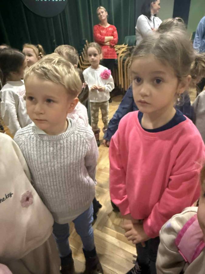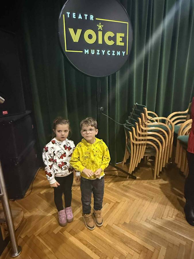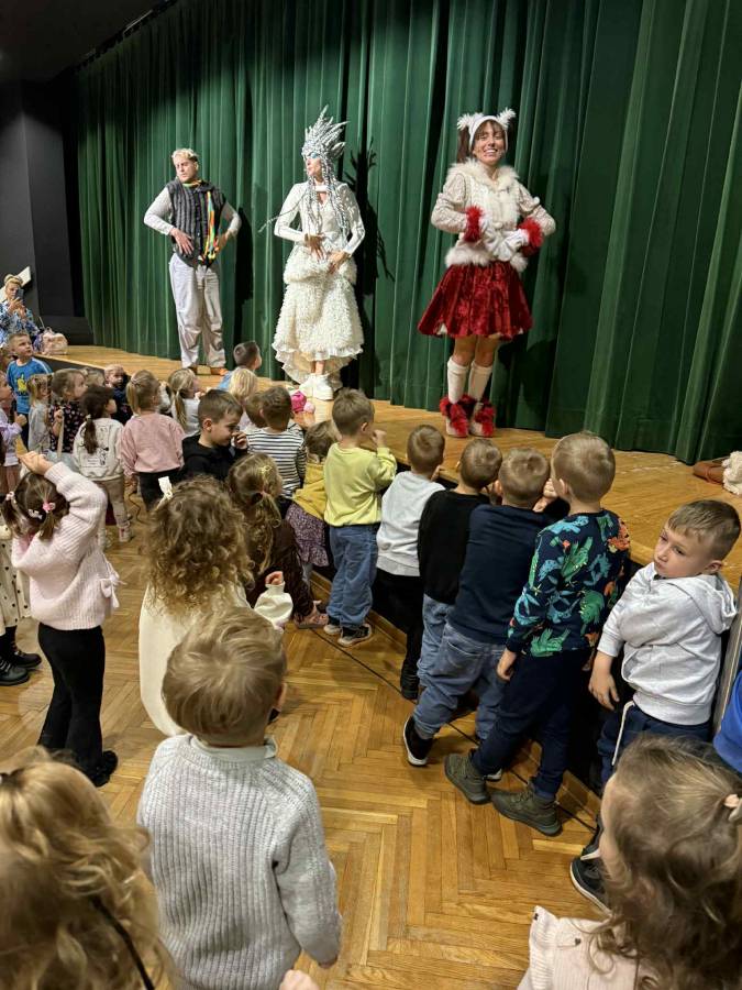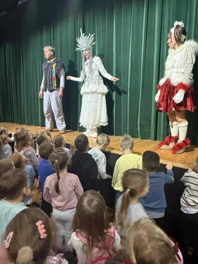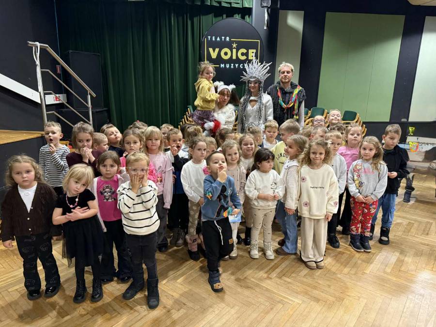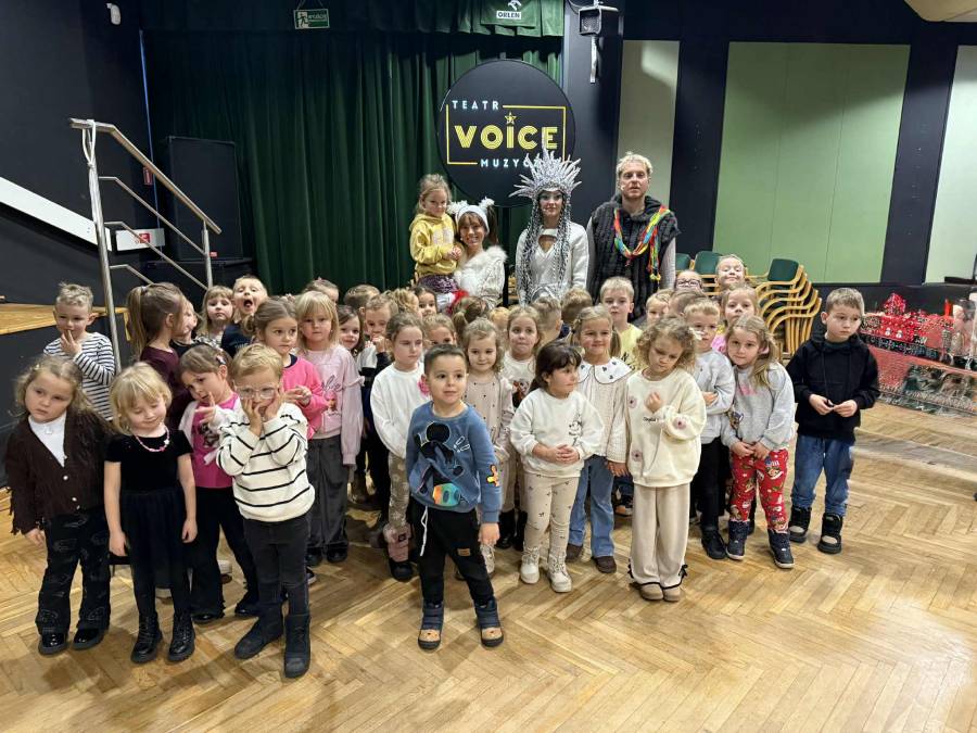9 grudnia dzieci z grupy Misie i Krasnale udały się na wycieczkę do Teatru Muzycznego Voice w Płocku na musical Królowa Śniegu. Po przybyciu na miejsce przedszkolaki zostały serdecznie powitane przez zespół teatru i zajęły miejsca na widowni. Musical Królowa Śniegu urzekł dzieci barwną scenografią, nastrojową muzyką oraz pięknymi kostiumami. Mali widzowie z zapartym tchem śledzili losy Gerdy i Kaja, reagując żywo na dynamiczne sceny i wesołe piosenki. Po przedstawieniu na dzieci czekała kolejna atrakcja- udział w warsztatach muzyczno- tanecznych prowadzonych przez aktorów występujących w musicalu. Przedszkolaki miały okazję nauczyć się fragmentów piosenek z przedstawienia oraz poznać kilka prostych choreografii. Warsztaty okazały się fantastyczną zabawą: dzieci śpiewały, tańczyły i z dużym zaangażowaniem naśladowały teatralne ruchy wykonawców.
