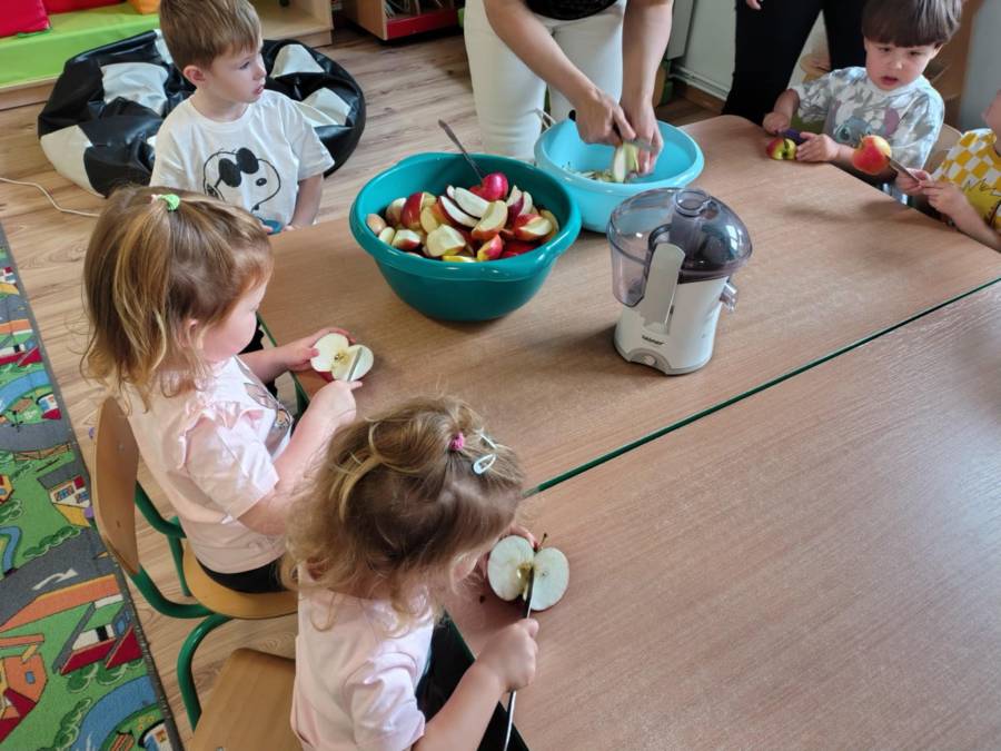 W październiku w naszym przedszkolu realizowany był pierwszy etap przedszkolnego projektu ,,Jem, rosnę, zdrowo żyję ,,Zadanie miesiąca, zatytułowane ,,Kolorowa miska zdrowia,, dostarczyło dzieciom wiele radości i okazji do poznania zasad zdrowego odżywiania. Przedszkolaki z entuzjazmem przystąpiły do przygotowywania zdrowych potraw- samodzielnie kroiły owoce, komponowały barwne sałatki i tworzyły owocowe szaszłyki. Podczas zajęć dzieci rozmawiały o wartościach odżywczych owoców, o tym, dlaczego warto jeść witaminy oraz jak ważne jest spożywanie świeżych produktów każdego dnia. Zajęcia były nie tylko smakowitą zabawą, ale również doskonałą lekcją samodzielności i współpracy w grupie. Kolorowe miski pełne zdrowych przysmaków stanowiły piękne podsumowanie październikowego zadania.
