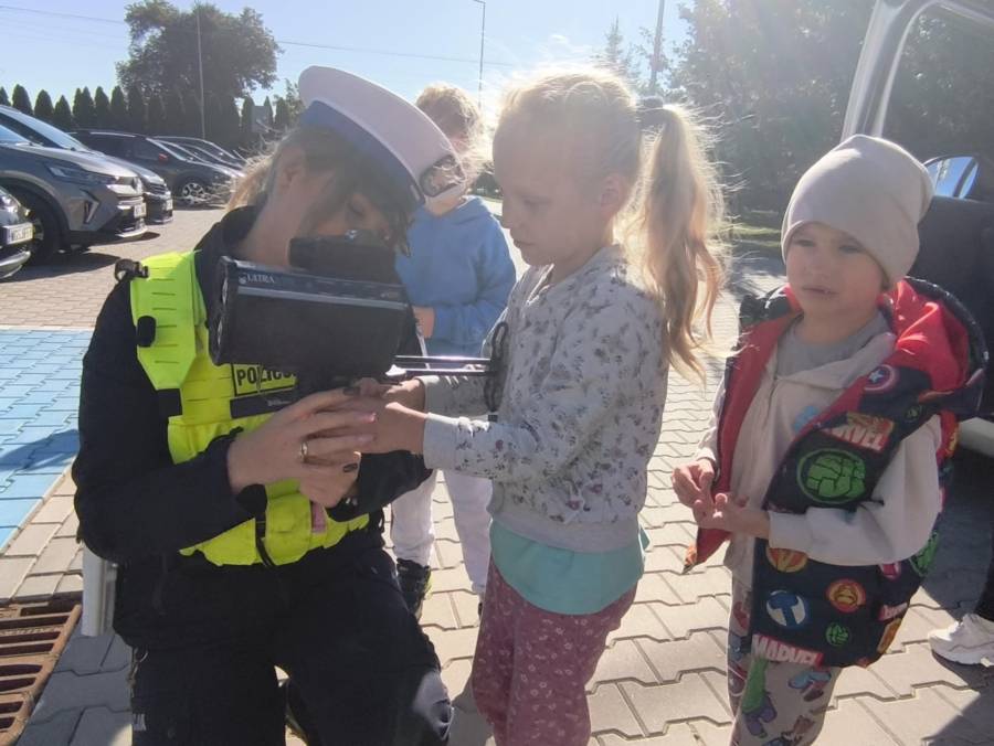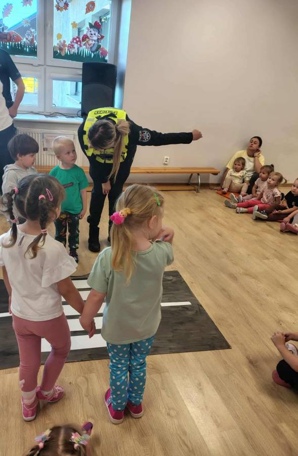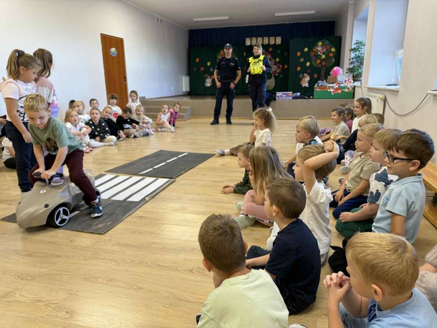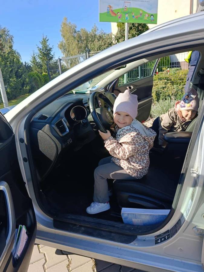 25 września w czwartek w naszym przedszkolu odbyło się spotkanie z policjantami. Głównym celem wizyty było przypomnienie podstawowych zasad bezpieczeństwa oraz zapoznanie z zawodem policjanta. Nasi goście przybliżyli dzieciom podstawowe zasady bezpiecznego poruszania się po drogach oraz przypomnieli numery alarmowe. Nasze przedszkolaki dowiedziały się, jak bezpiecznie podróżować, jak ważne jest zapinanie pasów bezpieczeństwa podczas jazdy samochodem. Panowie Policjanci nawiązali również do konieczności noszenia ubrań posiadających elementy odblaskowe. Podczas spotkania przedszkolaki zadawały pytania oraz dzieliły się swoimi doświadczeniami. Dużym zainteresowaniem cieszyła się prezentacja ubioru i wyposażenia policyjnego, niezbędnego podczas wykonywania pracy policjanta. Dużą atrakcją były radiowozy policyjne. Dzieci mogły je obejrzeć, usiąść na siedzeniach, wykonać pamiątkowe zdjęcie. Jednak najwięcej radości wzbudziło włączenie policyjnych syren.