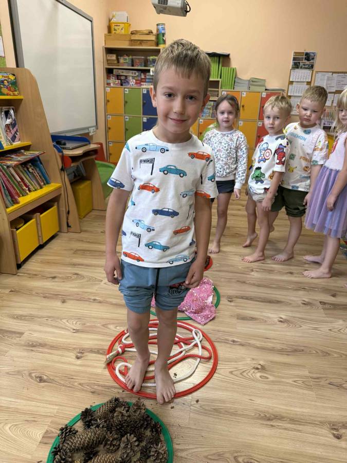 W naszym przedszkolu odbył się niezwykle ciekawy i radosny ,,Dzień bez skarpetek". Dzieci z grupy Krasnale tego dnia zdjęły skarpetki, by odkrywać świat za pomocą stóp! Na sali przygotowana została specjalna ścieżka sensoryczna, po której przedszkolaki chodziły boso, poznając różne faktury i struktury. Na trasie znalazły się m.in. miękkie liście, kłujące szyszki, chłodne kamyczki, strzelająca folia bąbelkowa, pucha włóczka, pachnąca lasem kora drzew itp. Dzieci z ogromną ciekawością i radością sprawdzały, co kryje się pod ich stopami, porównywały wrażenia i uczyły się opisywać swoje odczucia. Nie zabrakło również zabaw ruchowych, masażyków stóp i relaksu przy spokojnej muzyce.
